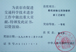 ◆ 1996年 “船機曲軸無刻蝕鍍鐵新工藝研究”獲交通部科技進步一等獎;