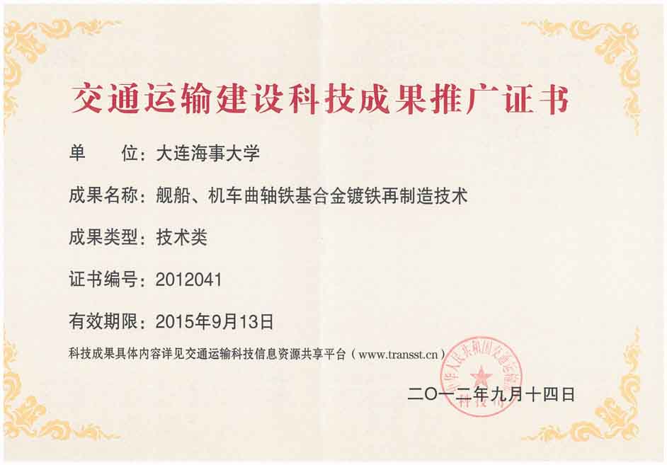◆ 2012年 “鐵基合金鍍鐵再制造技術”獲得交通部交通運輸建設科技成果推廣證書。
