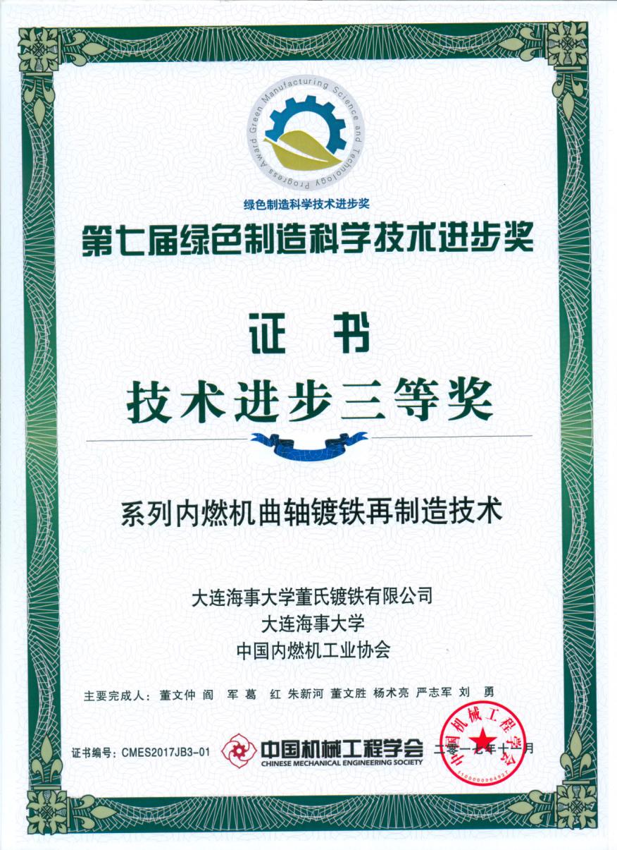 ◆ 2017年 “系列內燃機曲軸鍍鐵再制造技術” 獲中國第七屆綠色制造科技進步三等獎。